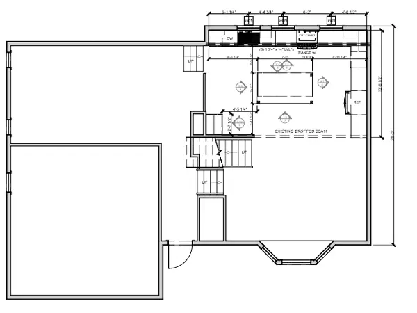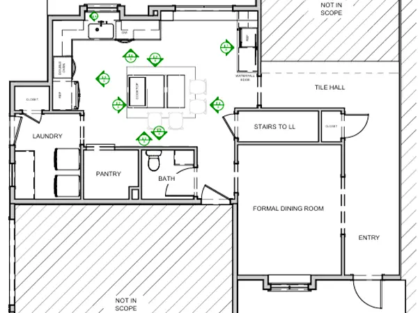 Custom plan for a main floor including kitchen, dining room, living room, electrical and structural updates.