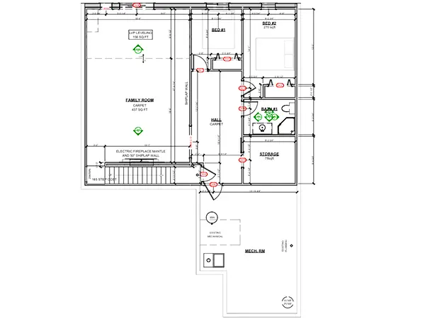 Completely livable basement with family room, hall, two bedrooms, 2 bathrooms, mechanical room, and storage area.
